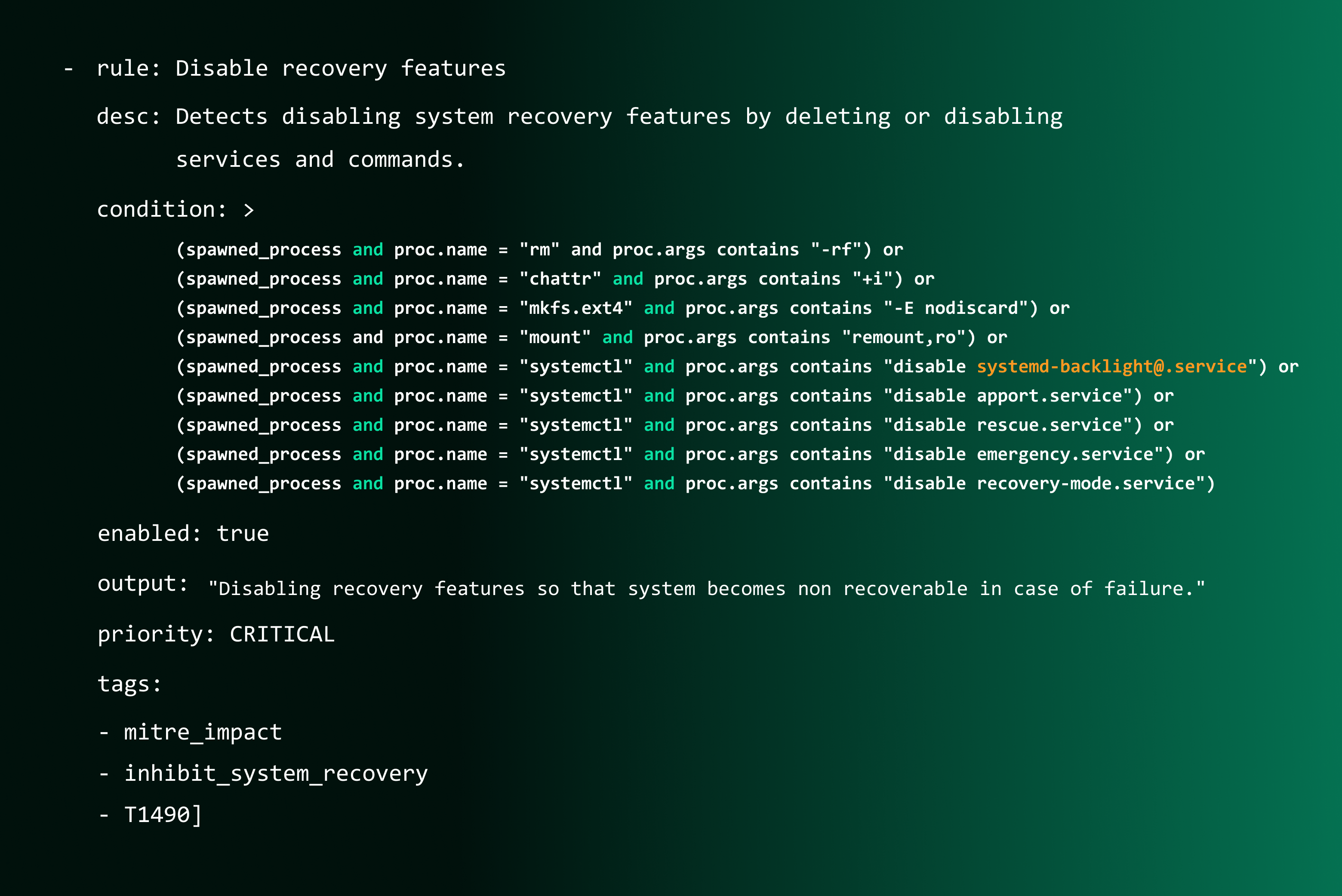 It is essential to adhere to the specified Falco format while crafting these conditions. Additionally, we must include exceptions to prevent false positives. Now, let us proceed to outline some fundamental conditions that will activate the desired event. - condition: > (spawned_process and proc.name = "rm" and proc.args contains "-rf") or (spawned_process and proc.name = "chattr" and proc.args contains "+i") or (spawned_process and proc.name = "mkfs.ext4" and proc.args contains "-E nodiscard") or (spawned_process and proc.name = "mount" and proc.args contains "remount,ro") or (spawned_process and proc.name = "systemctl" and proc.args contains "disable systemd-backlight@.service") or (spawned_process and proc.name = "systemctl" and proc.args contains "disable apport.service") or (spawned_process and proc.name = "systemctl" and proc.args contains "disable rescue.service") or (spawned_process and proc.name = "systemctl" and proc.args contains "disable emergency.service") or (spawned_process and proc.name = "systemctl" and proc.args contains "disable recovery-mode.service")